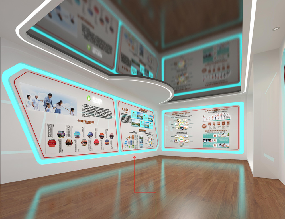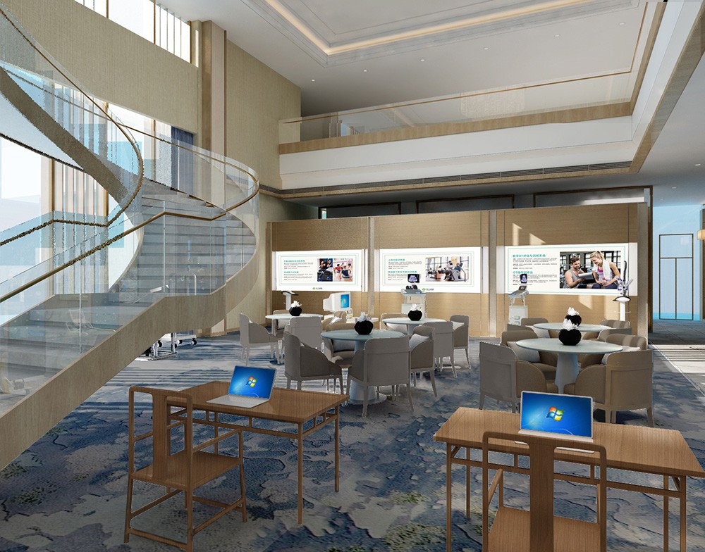 設計說明:銷售中心分為營銷大廳、接待區、3D影音室、9A工法展示區、兒童游樂區、簽約區、會議室七大功能分區;天花與地面形大理石材質互相呼應,讓人感受營銷大廳空間的高貴與大氣;雙旋轉樓梯圍繞著沙盤,彰顯了銷售中心霸氣的設計;就像9A工法展示區的蒂芙尼藍的與眾不同,秉承始終如一和精準悉心打造,從設計到施工到入住打造一個環境優美并安全的入住空間;兒童游樂區的貼心設計,讓用戶在購房的過程中能安心無憂的接收樓盤信息,對于兒童來說是一個新的游樂環境。